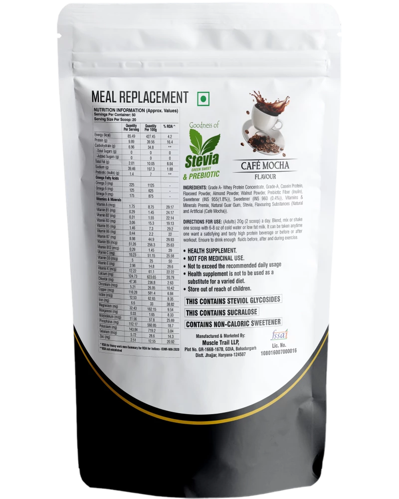 INGREDIENTS: Whey Protein Concentrate, Whey Powder, Almond Powder, Walnut Powder, Flaxseed Powder, Micellar Casein, Barley Malt, Prebiotic Fiber (Inulin), Cocoa Powder, Natural Guar Gum, Stevia, Flavouring Substances (Natural Flavour), Sweetener (INS 960 (0.4%)).